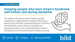 Join us on 26 November at 12:30pm for a free webinar presenting the award-winning workbook for families and carers: ‘Keeping people who have Down’s syndrome well before and during dementia’.